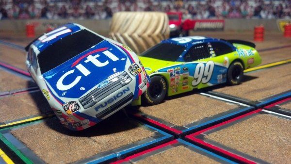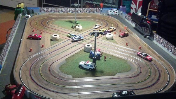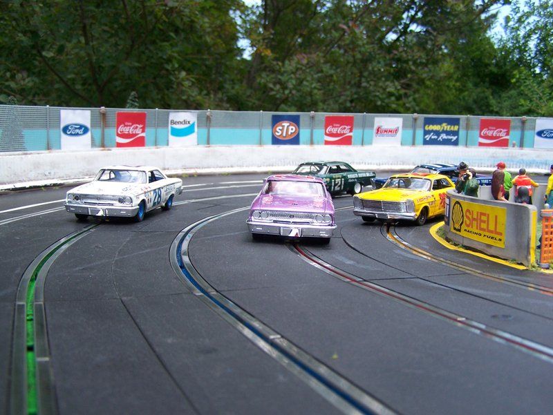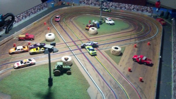 We have designed and custom built numerous tracks over the years. One is a 5 lane 1/30 second slot car track- mildly banked oval. To keep things simple, your controller, car and lane are all the same color. Standard racing is the most number of laps in either one or two minutes wins the race. Organized slot car tournaments are also available.
